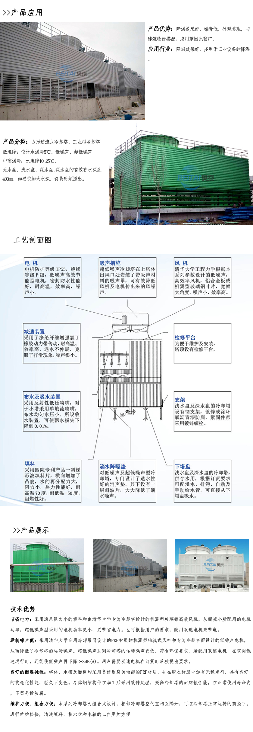工業(yè)型玻璃鋼冷卻塔,室友機(jī)械工業(yè)部第四設(shè)計(jì)研究院在原設(shè)計(jì)的同類塔測(cè)試數(shù)據(jù)基礎(chǔ)上改進(jìn)設(shè)計(jì)的。本設(shè)計(jì)的特點(diǎn)是冷卻塔風(fēng)機(jī)配有變扭矩雙速電機(jī);當(dāng)氣溫較低時(shí),例如晚上,電機(jī)開低速,冷卻噪聲可低3-5dB(A)。此外,選用雙速電機(jī)節(jié)電顯著。多臺(tái)冷卻塔配單速電機(jī)時(shí),為了節(jié)電,當(dāng)空氣濕球溫度低時(shí),可停部分電機(jī),但仍比用雙速電機(jī)(以年計(jì))多耗電40%。